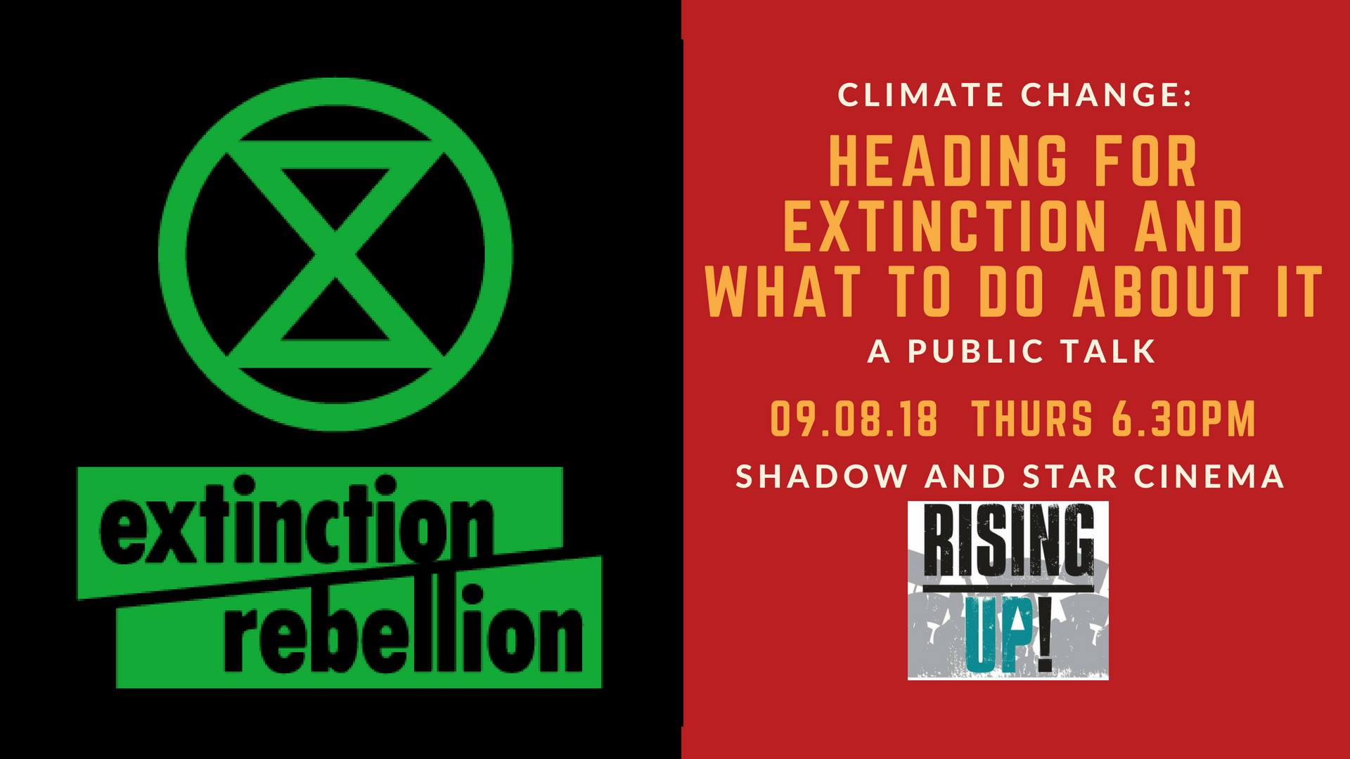 In this public lecture, Rising Up members will explain why we are entering a climate apocalypse and show how denial mechanisms stop us from seeing what is now obvious. Based upon award winning PhD research on effective campaign mobilisation, they will outline the political response necessary to maximise the chances that we will avoid the extinction we are presently racing towards.