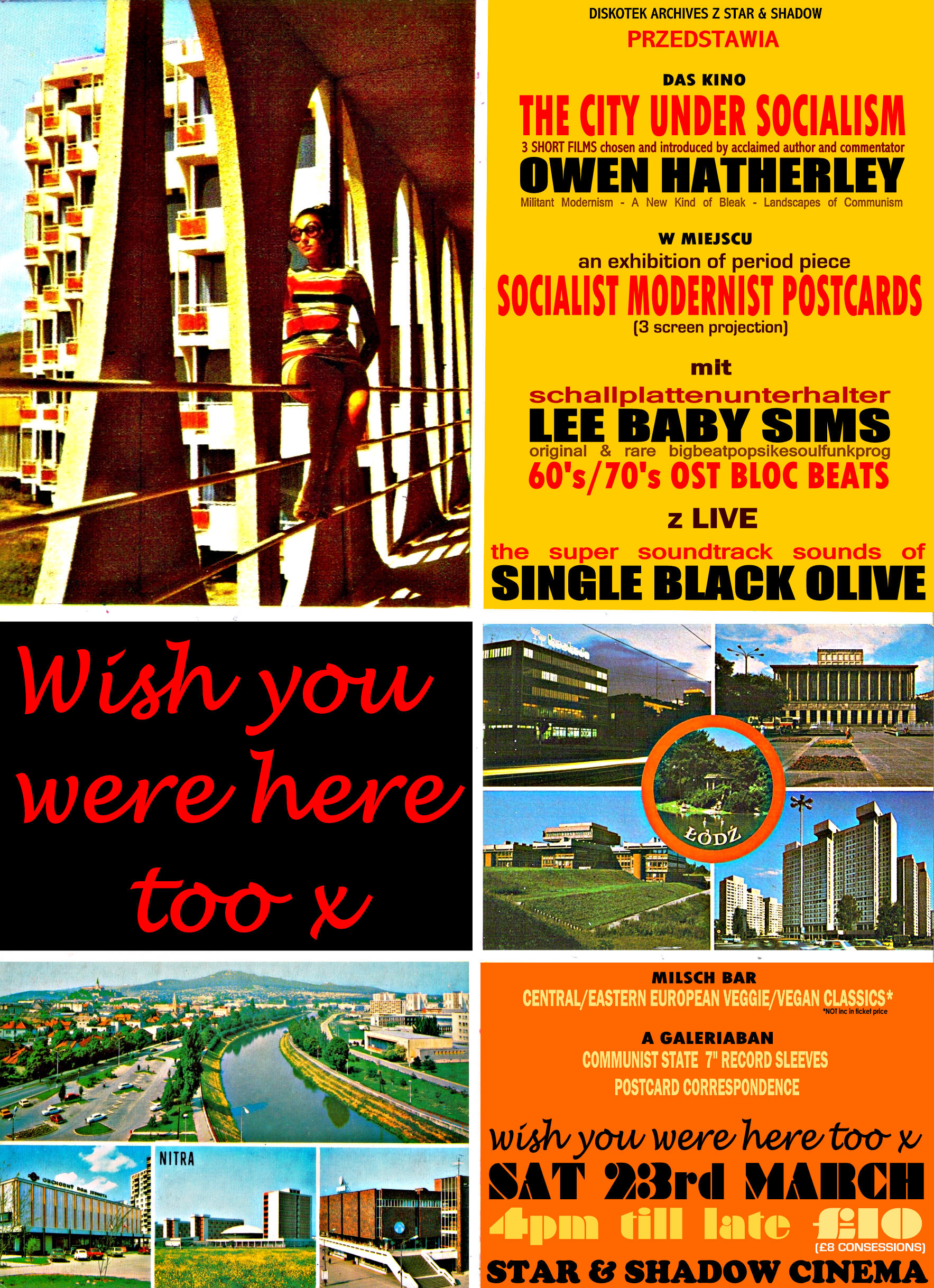 Between films and the exhibition The Star and Shadow café cum Milsch Bar will be serving up some classic vegan and vegetarian Central/East European dishes while the gallery space will play host to an exhibition of OST Bloc Sound record sleeves and postcard correspondence.