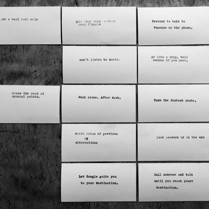 Instructions for Walking Women is a growing archive of instructions for walking initiated by artist Tess Denman-Cleaver and written by and for women. It is continuously developed through workshops and interventions in a variety of settings. The first Instructions for Walking Women workshop was held as part of a Sisters Uncut takeover of NewBridge Gallery during Hidden Civil War (2016). Instruction cards created during workshops reveal the way that women experience and navigate public space, and invite consideration of who is allowed to walk where, and how. This workshop, developed for WFOS#2 (Newcastle), will invite women to engage with the existing archive of instructions and to share their own experiences of walking - in the everyday and within the context of walking art and sound-walking practices.