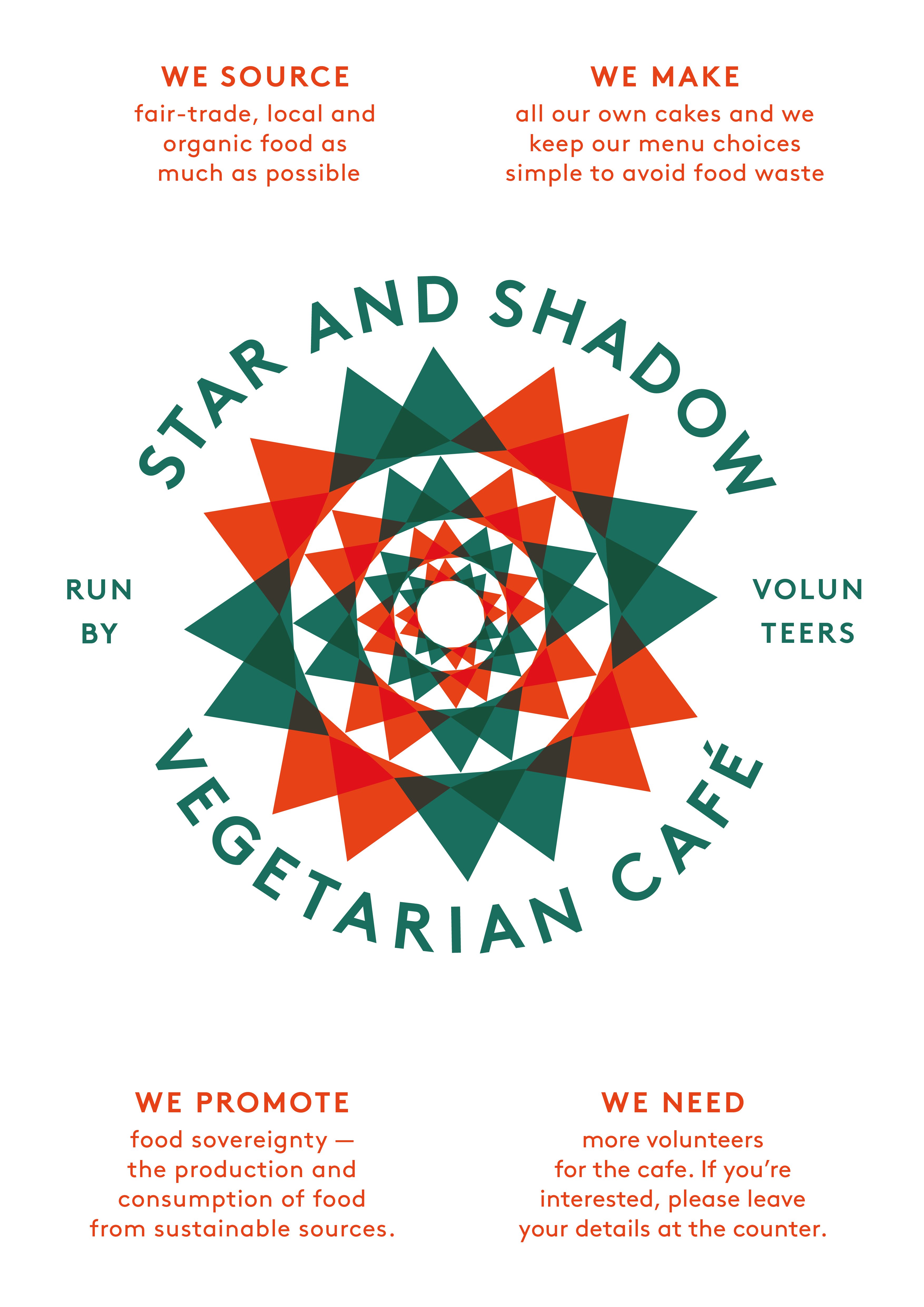 The Star and Shadow Café is a volunteer run activist project within the Star and Shadow. It is concerned with promoting fair trade and organic food, local suppliers, food sovereignty, training, socialising by means of workshops in the café area or just meeting up and hanging out.