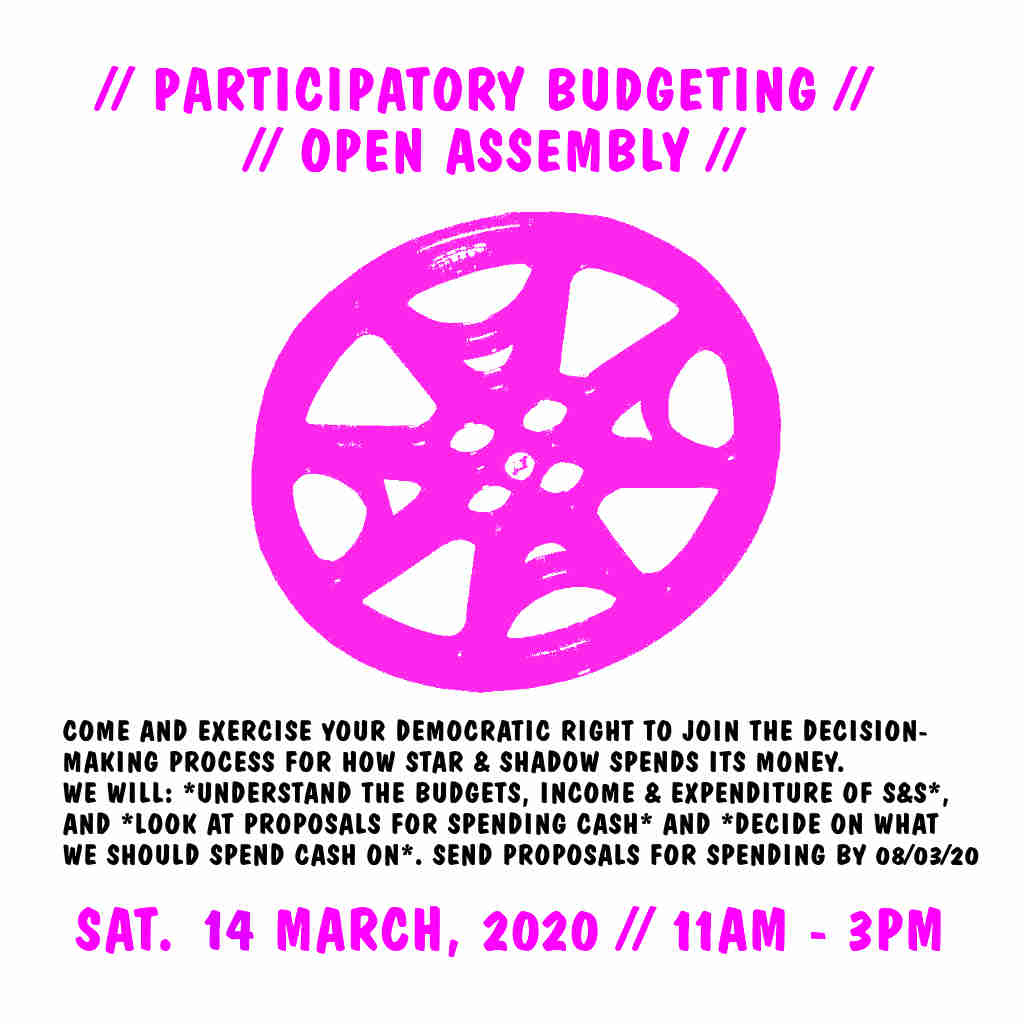 As volunteers in an organisation which has no boss, we all get to decide how things work at Star and Shadow Cinema Coop. Even if we have only just started. We have organised a session to encourage more involvement in the democratic processes of the Star and Shadow - please come to our open assembly and participatory budgeting session, from 11am-3pm on Saturday 14th March 2020.