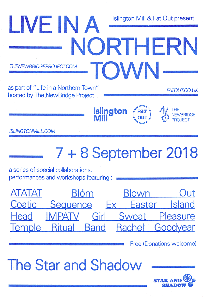 For this project, Stina Puotinen, Studio & Events Manager at Islington Mill, has teamed up with longtime Mill resident Emma Thompson – of Fat Out music promotion – to select musicians to be paired with visual artists from the Mill’s network. Taking place between The Star and Shadow and The NewBridge Project, the two-day program highlights Islington Mill’s signature mix of music and visual arts, and will showcase musicians from Liverpool, Salford, Leeds and Newcastle.