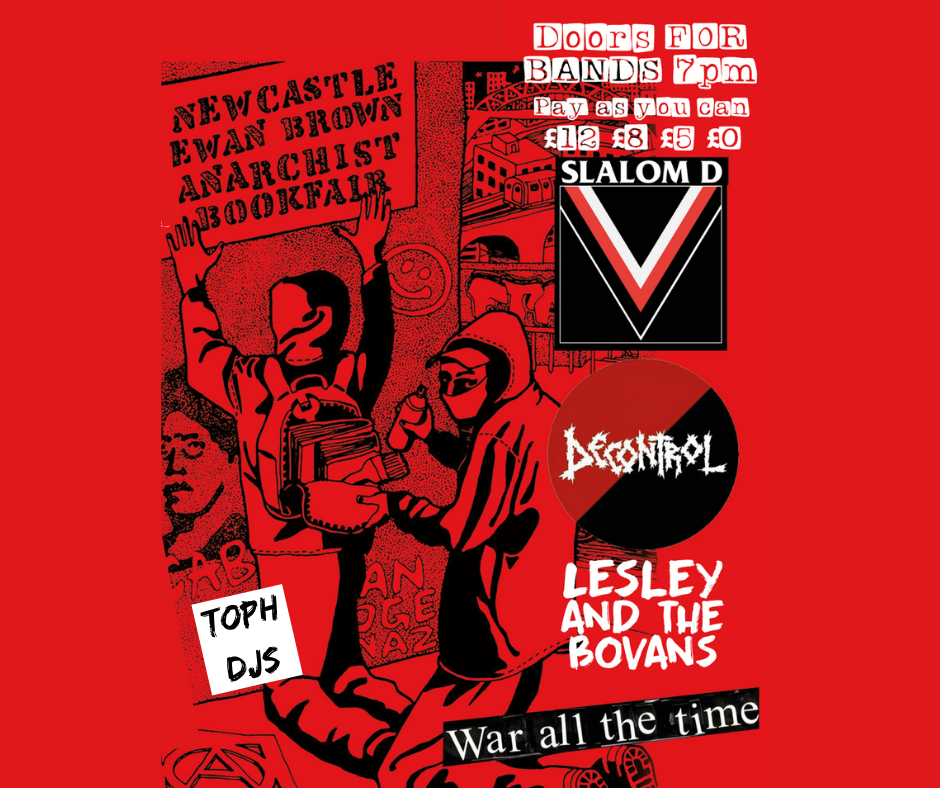 Local legend punk and folk bands - Slalom D, Decontrol, Lesley and the Bovans, War All The Time. After Party of the Newcastle Anarchist Bookfair, in memory of Ewan Brown.