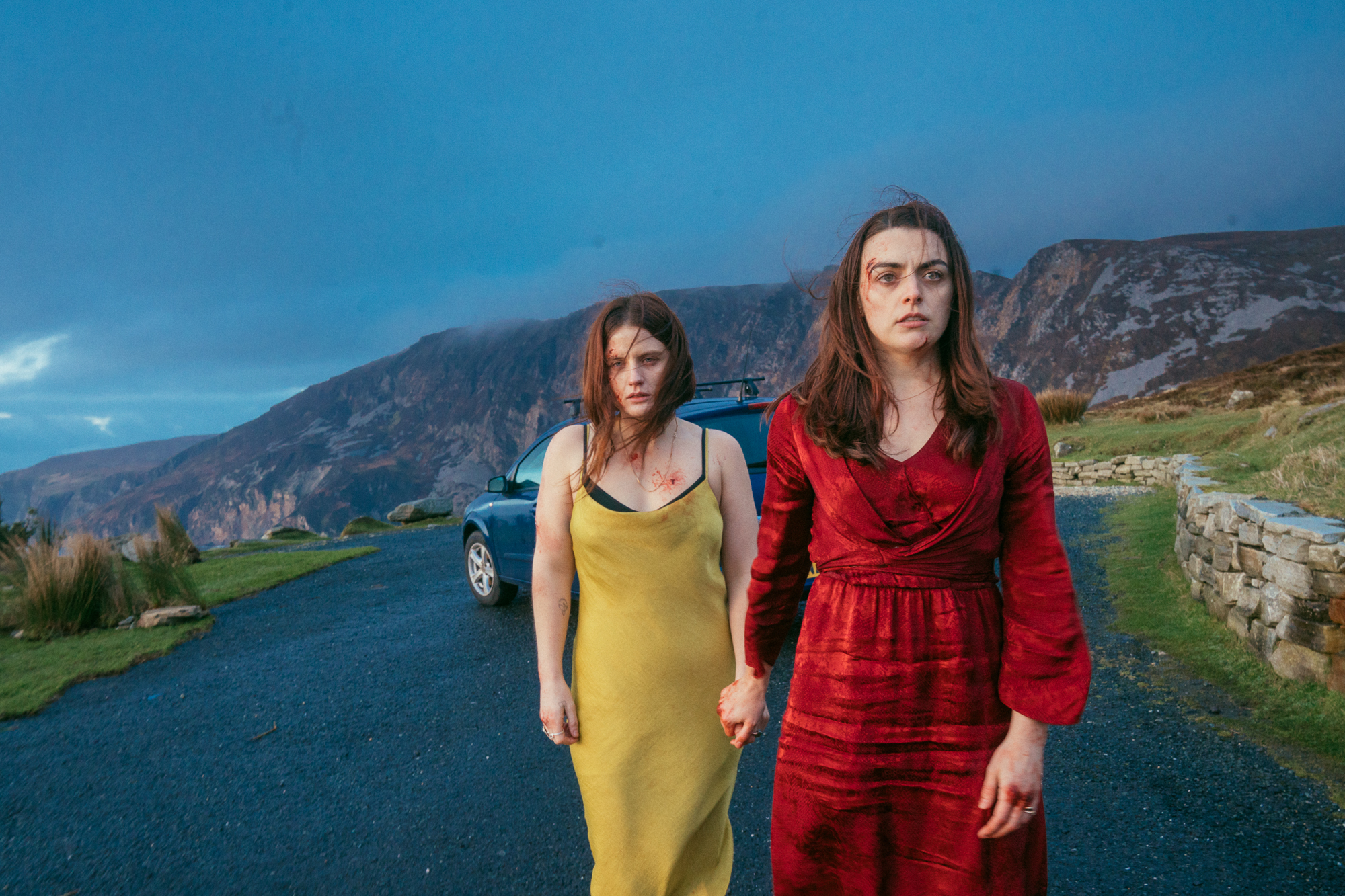 Image description: Still from Wildfire. Two sisters with some scratches on their faces hold hands while walking away from a car on a clifftop.