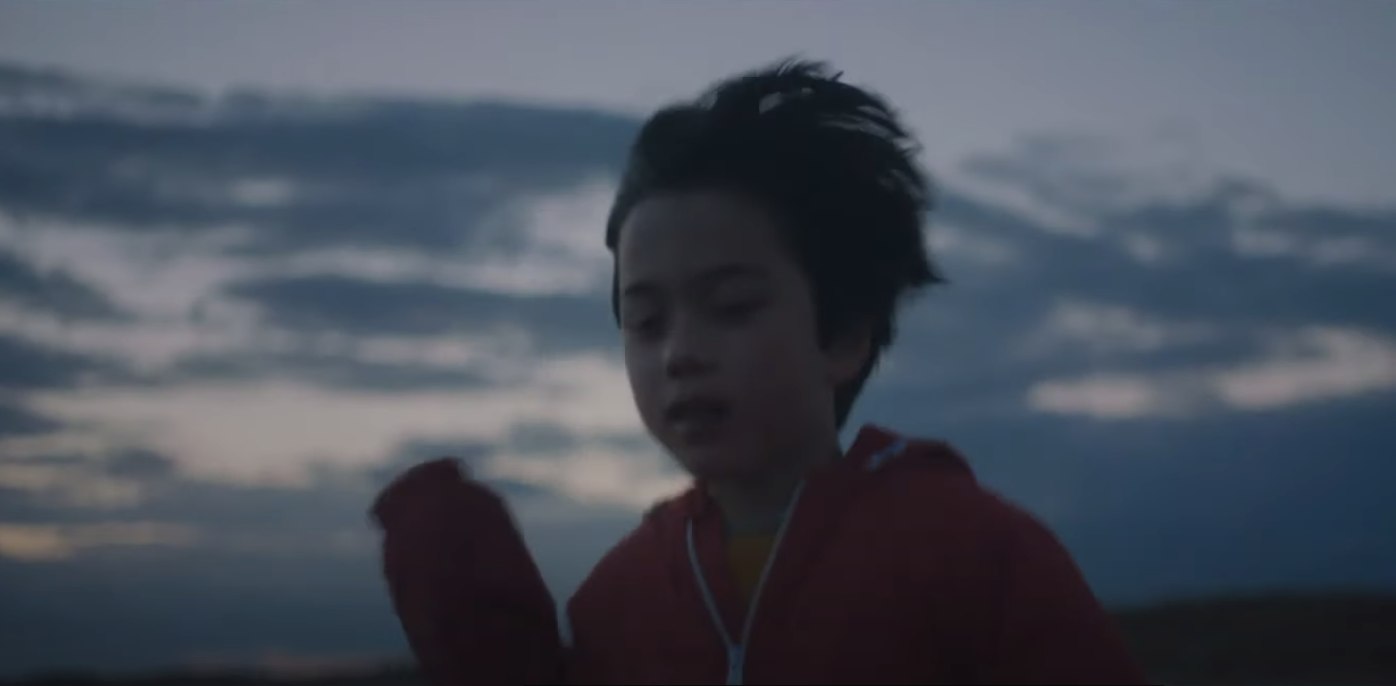 Image description: Still from the film: The Reason I Jump. A child with short black hair wearing and wearing a red jacket running outdoors against a cloudy evening backdrop.