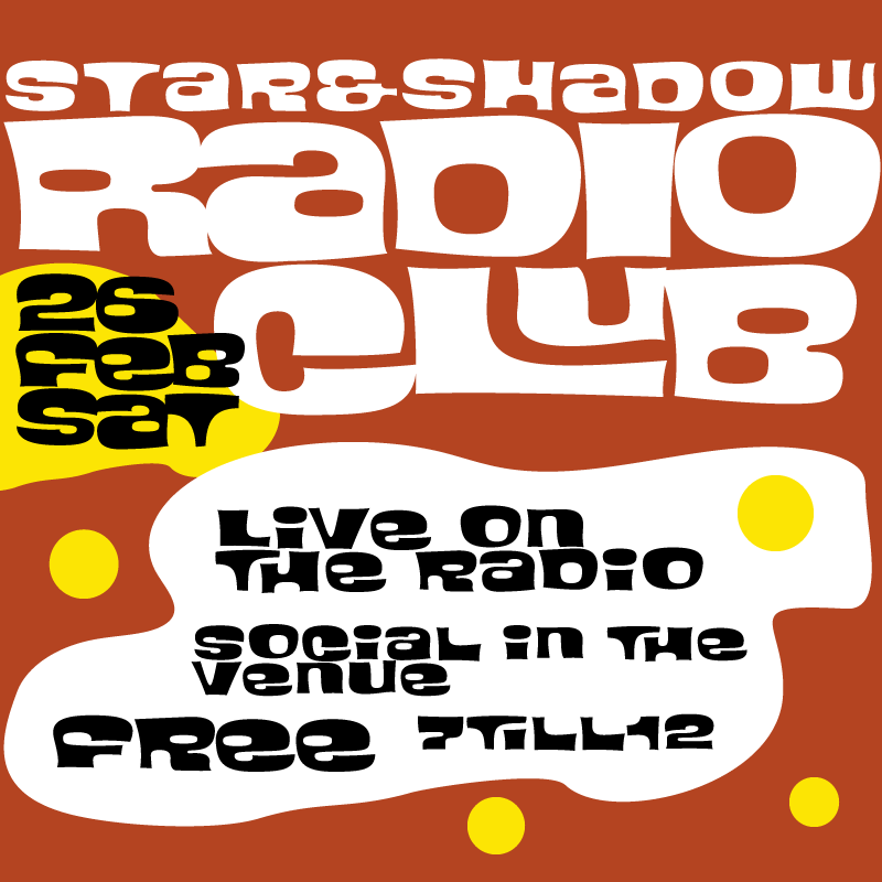 Listen to a Star Studded rotation of Star & Shadow Radio Disc Jockeys playing the tunes, we'll be broadcasting out live into the ether from the venue , so wether you are in Washington, West Auckland or Wa'ahun join us through your airwaves.