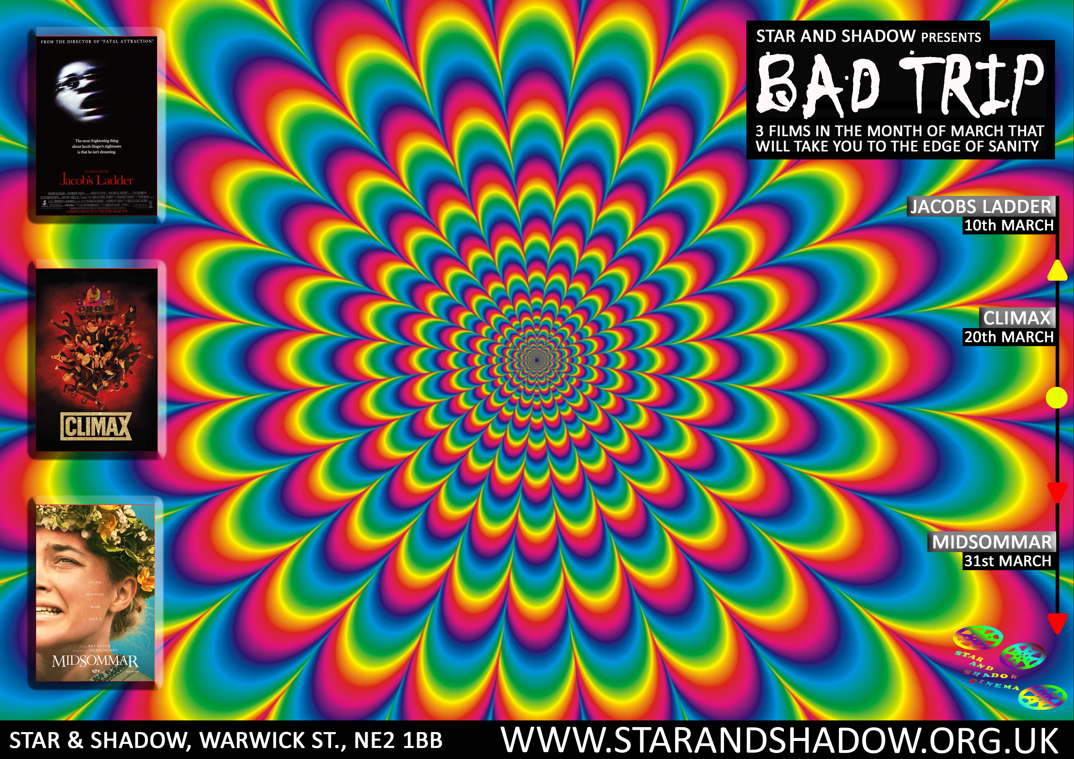 All through March Star and Shadow presents a new season - BAD TRIP. Three films that explore the dark themes of nightmare hallucinations. Bad Trip will take you on a journey through the unsettling reality of Jacob's Ladder, the hypnotic dance that will unravel your mind in Climax, and cult rituals that will take you to the edge of sanity in Midsommar.
