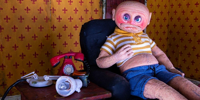 Image description: Still from a stop motion animated short film. A person with shaved hair, ace stubble and rosy cheeks sits in an armchair. They are wearing a yellow t-shirt too small for them exposing their belly and blue shorts revealing stubbly legs. A red telephone and a broken white table lamp are on a side table beside them. In the background is badly applied yellow and red patterned wallpaper.