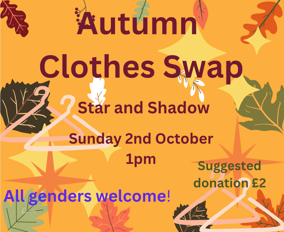 Image Description: Poster on an orange background with autumn leaves, stars and clothes hangers. Bold text says: Autumn Clothes Swap, Star and Shadow, Sunday 2nd October 1pm, Suggested donation £2, All genders welcome!