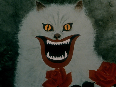 Image description: Portrait of a white cat with demonic yellow eyes, a joker-like smile and sharp, vampire-like teeth. Th background is a smudged forest green and there are red roses in the foreground.
