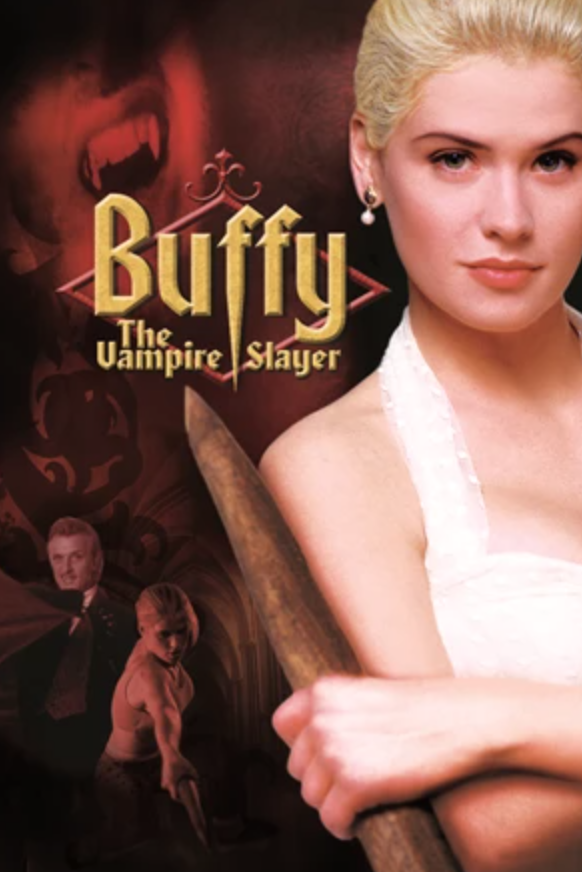 Image Description: Poster for the film Buffy the Vampire Slayer with Kristy Swanson as Buffy, a blonde teenager, to the right holding a wooden stake. Behind her to the left there is a gothic red background with Buffy and her Watcher, Giles, training in the background. Above them is an image of a vampires face.
