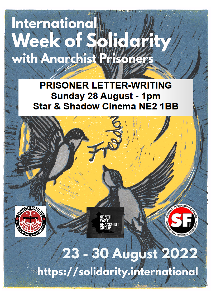 During Solidarity With Anarchist Prisoners Week, we are holding a prisoner letter-writing session. Come along and give practical support to people jailed for fighting against authoritarianism & repression. Free event & all materials provided. The cafe will be open for refreshments & delicious vegan treats. Child-friendly event with activities: colouring books, crayons etc. so please bring younger people along.