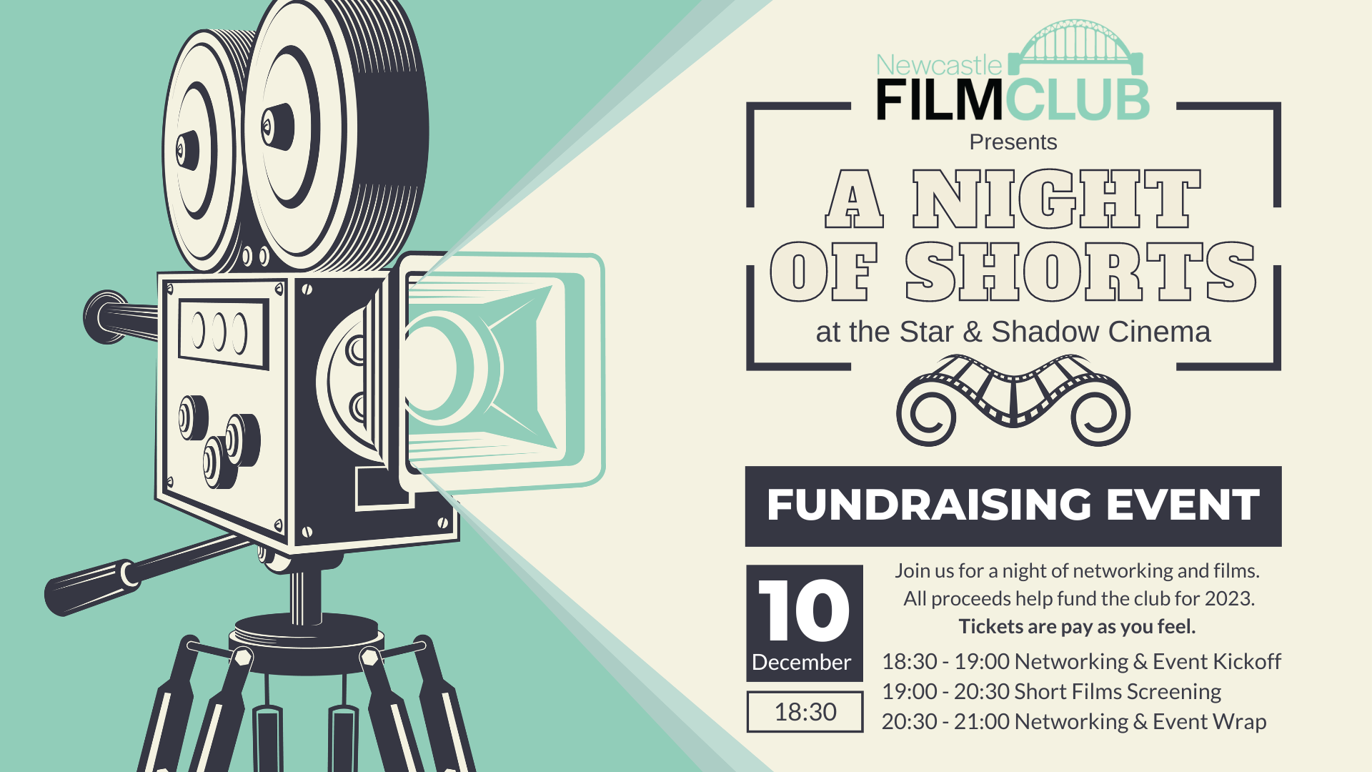 All proceeds from the evening will go back into Newcastle Film Club to help support our members in 2023. Donations go towards our next short film, monthly film challenge prizes, guest speakers, and much more.