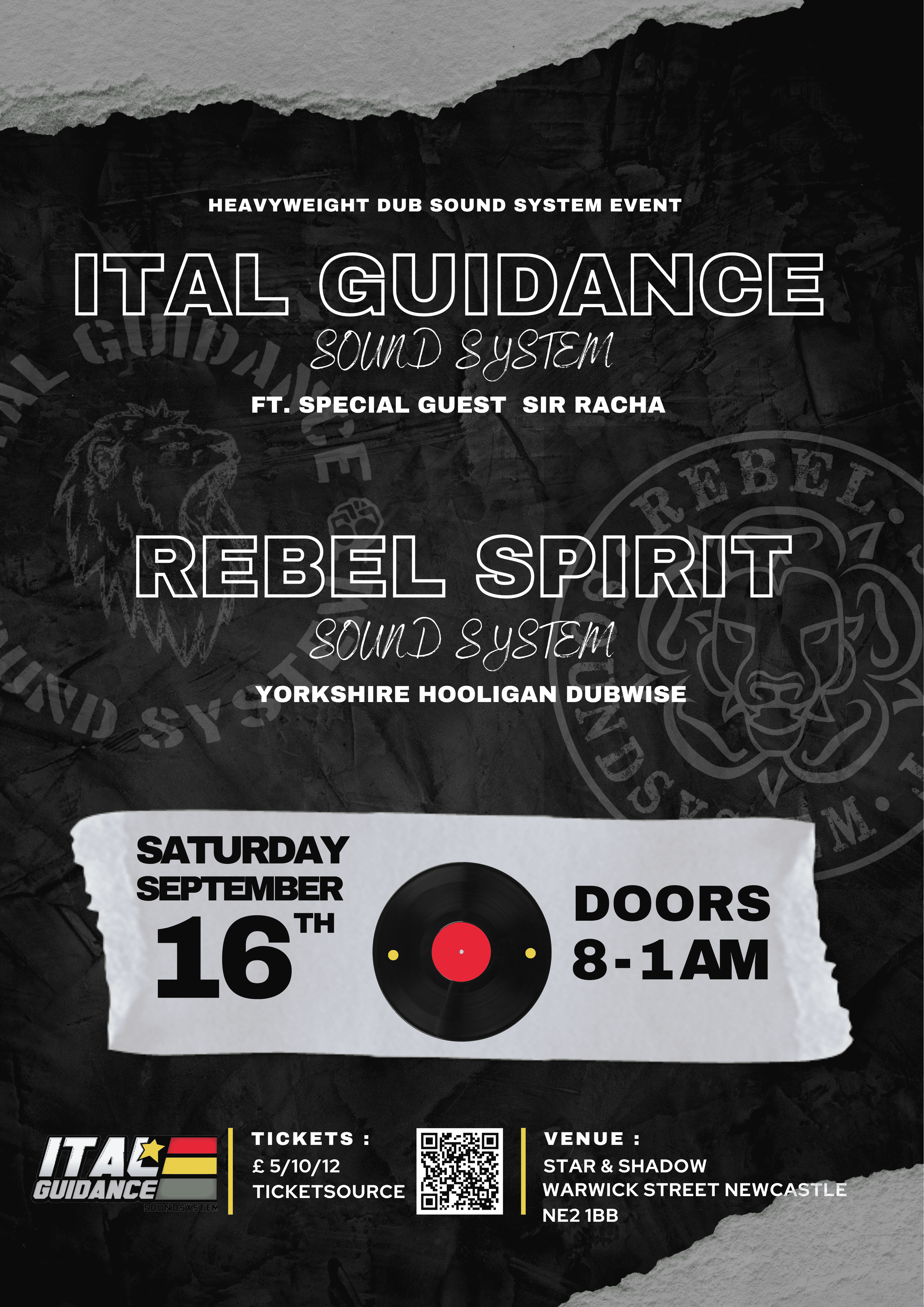 Newcastle's Ital Guidance Sound System Ft. special guest Sir Racha meets Leed's Rebel Spirit. Expect a night of heavyweight basslines, conscious lyrics and a positive vibe !