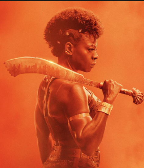 Image Description: Taken from an orange tinted Woman King poster, a warrior woman stands facing sideways holding a weapon over her shoulder.