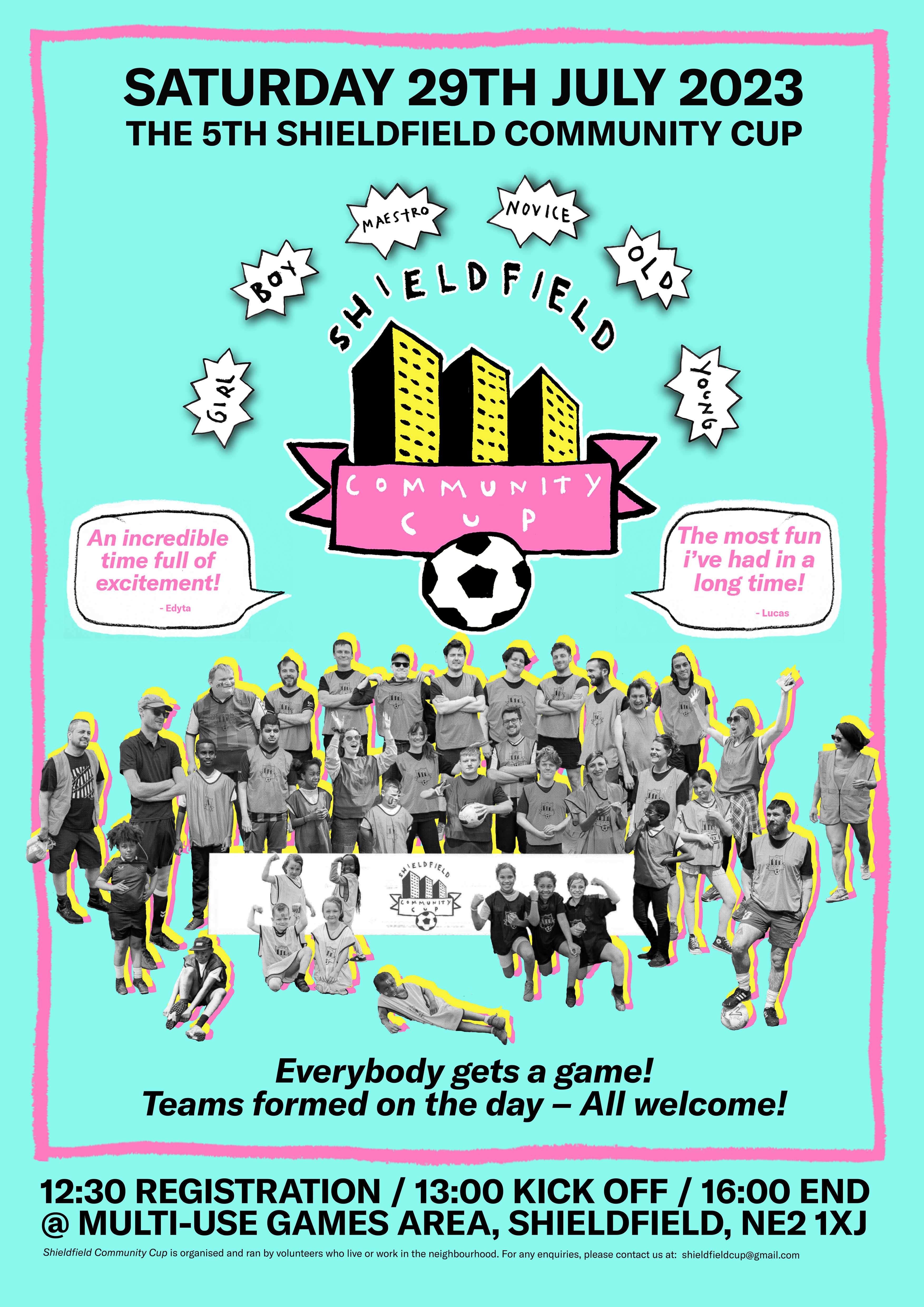 In May 2019 we held The 1st Shieldfield Community Cup. Ten teams popped up on the day, a huge range in age and ability, and about 100 spectators came out to watch, some bearing cakes... it was a fantastic event and many people said: