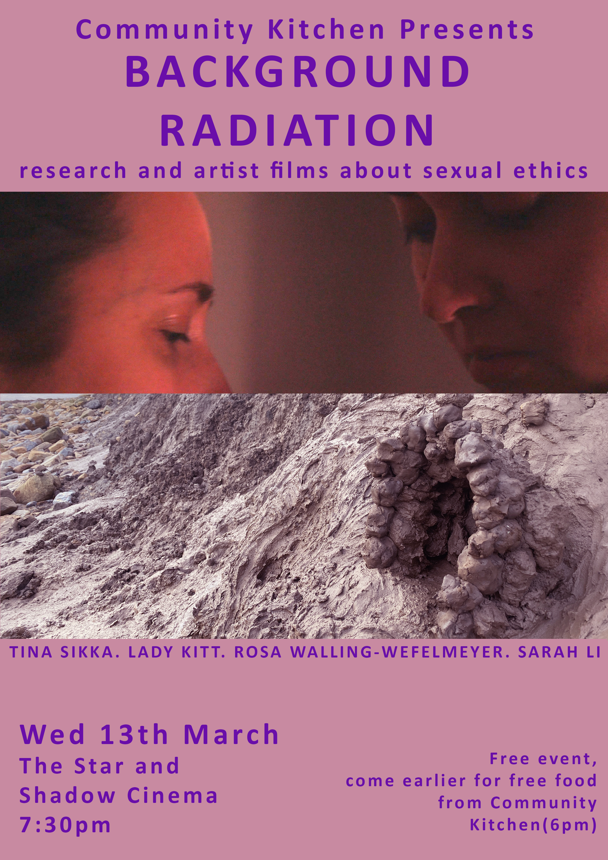 [IMAGE DESCRIPTION: digitally made poster with a pink background, it has two photos in the centre of the poster and text. The text is purple and reads: "Community Kitchen Presents: Background Radiation. Research and artist films about sexual ethics. Tina Sikka, Lady Kitt, Rosa Walling-Wefelmeyer, Sarah Li. Wednesday 13th March, The Star and Shadow Cinema, 7:30pm. Free event, come earlier for free food from Community Kitchen (6pm)" The first photo in the centre is a colour photo depicting a close up of the eyes of two people whose faces are very close to each other, their gazes are cast downwards. The second image is a colour photo, exterior. In the forefront, the right side is a small shrine-like structure built from balls of natural clay. The shrine is surrounded by earth and clay, and is embedded into the earth with a shelf carved out for it to sit on.]