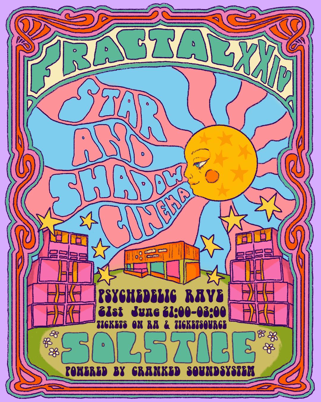 Not-for-profit psychedelic collective Fractal Nights debuts are the Star and Shadow. For the past 6 years, Fractal has been showcasing the trippy and experimental music across the Northeast and Bristol. Powered by the Cranked Soundsystem, we will bring the full spectrum of psychedelic sound to a place where there is no creative boundaries and genre limits. Expect immersive AV, space to sit, dance, connect, and explore as we celebrate the summer solstice — a time to come together and honour the power of light, unity, and life. We operate an inclusive environment. Discrimination of any sort is not acceptable and will result in a ban from our event.