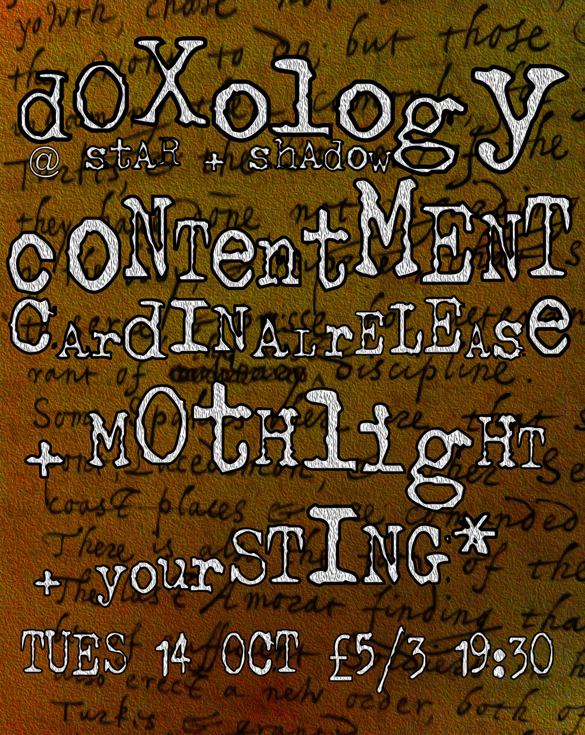 The October Doxology sees a headline set from rising starts of the Northeast, Contentment, an exploratoty fusion set from Cardinal Release, handmade elecrtronic music adventures from Mothlight, and a solo unplugged outing from Gwilly Edmondez presenting 'your STING' songs from the depths of ailment.