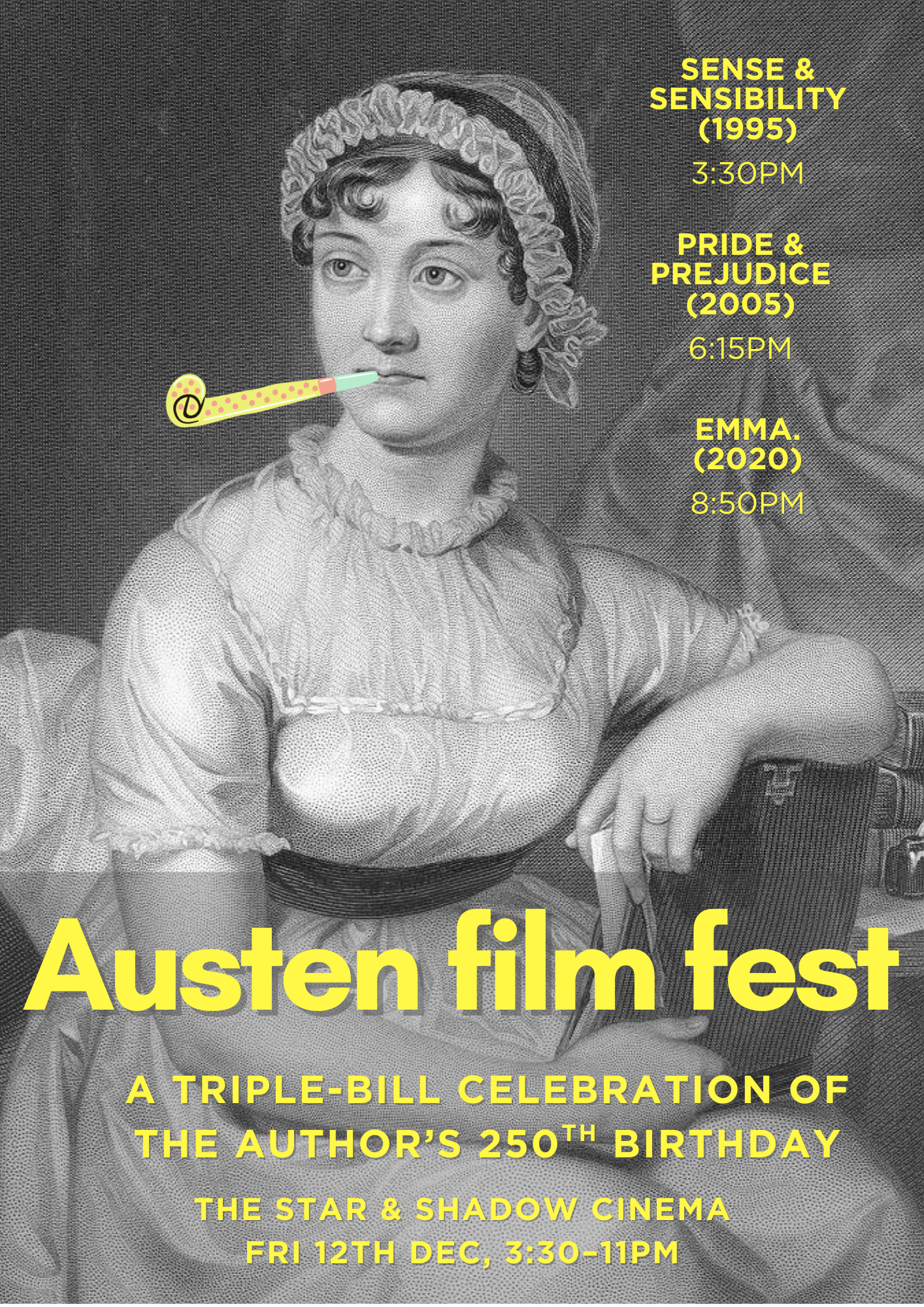 Please note that, as it's a long event, the films will be starting on time. No trailers, adverts or hanging about! There will be half-hour breaks between films, during which you're welcome to relax in the café or go grab something from the corner shop. In the DIY cinema spirit, feel free to bring a cosy blanket, thermos of tea or entire Austen-themed birthday cake with you – whatever you fancy.