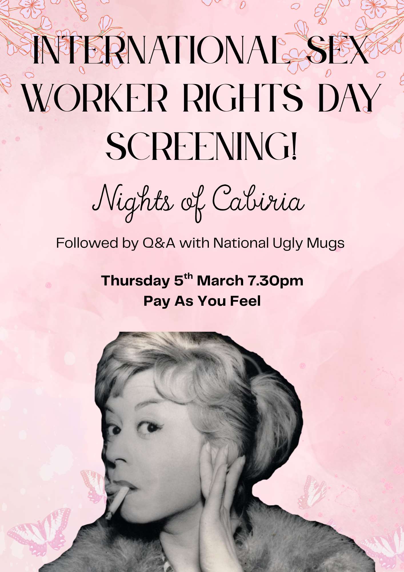 It is International Sex Worker Rights Day on March 3rd, to celebrate this, we will be showing the Italian classic, beloved by many a sex worker, Nights of Cabiria, with English subtitles. Whilst we do celebrate this day, it is also important to consider the ongoing stigma and lack of worker rights that sex workers still currently face. This will be followed by a Q&A by National Ugly Mugs.